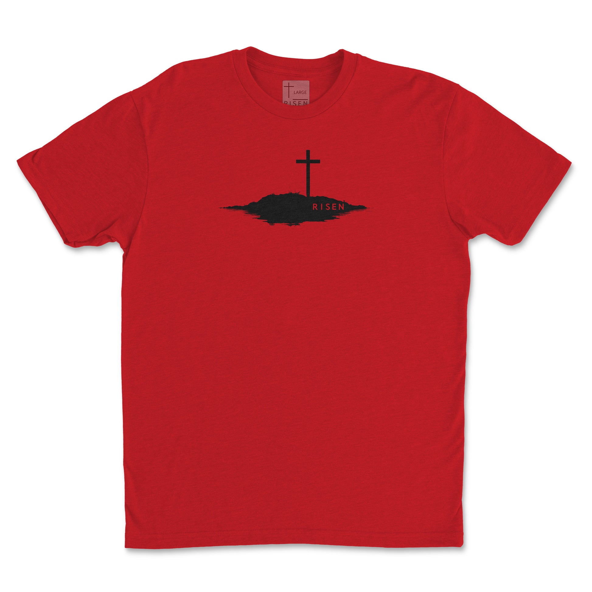 Unmoved Men’s Christian T-Shirt – RISEN Cross Graphic Tee built for men who stand firm regardless of circumstance. Featuring a minimalist cross planted on a solitary hill with a subtle reflection beneath, this design represents steady faith, unshaken conviction, and strength rooted deep.
